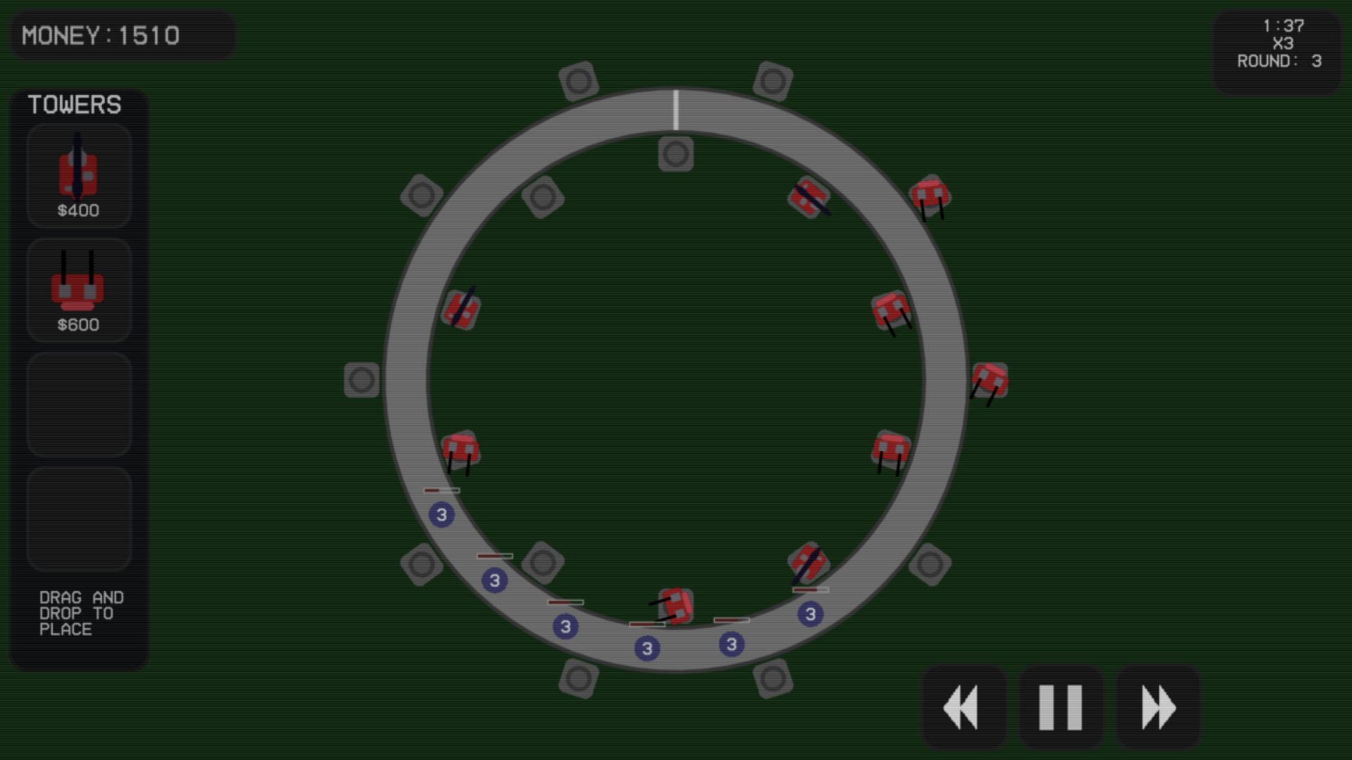 A tower defence where the track is in a loop, when the enemies make it round the entire loop they upgrade increasing their health. Place towers to destroy all enemies before the timer runs out